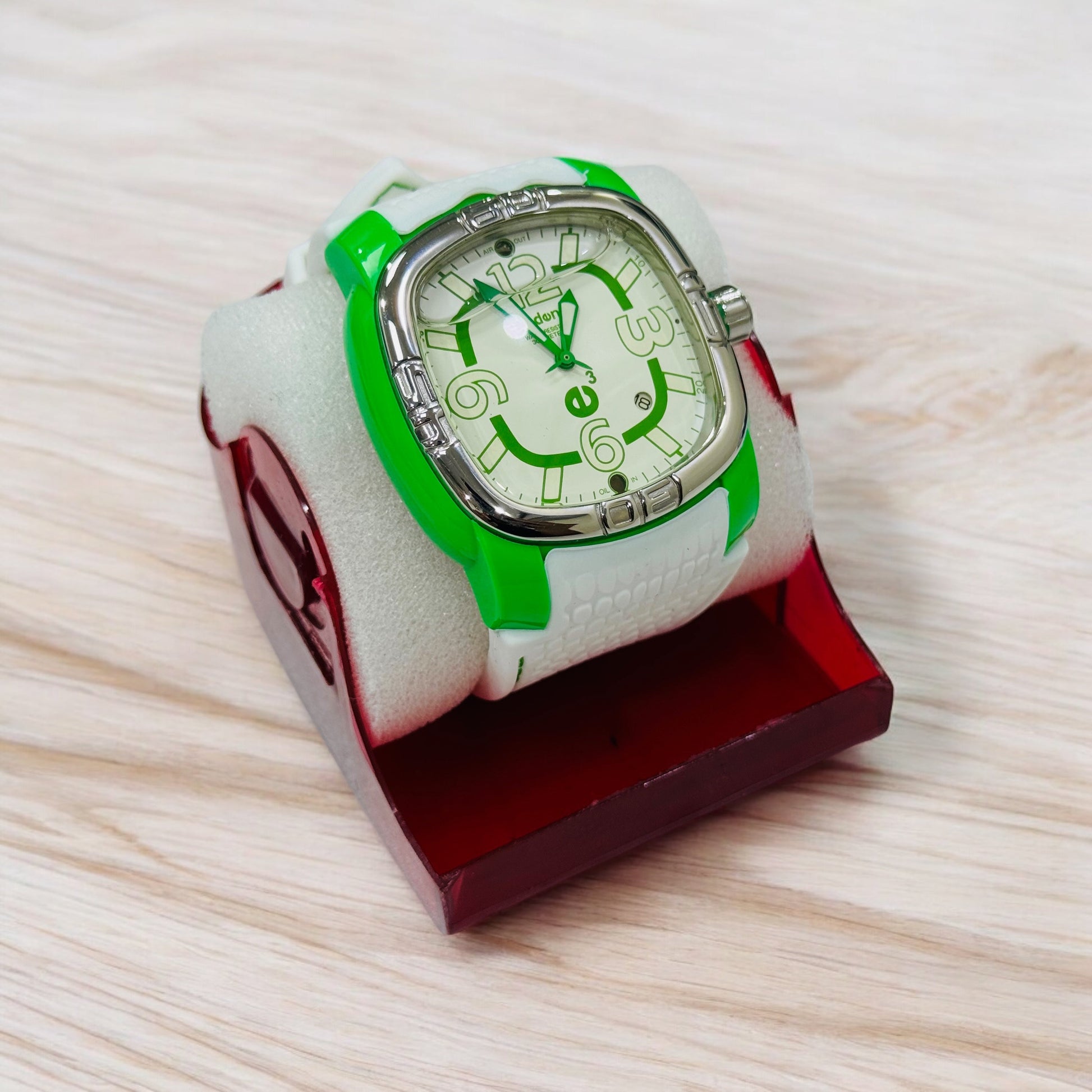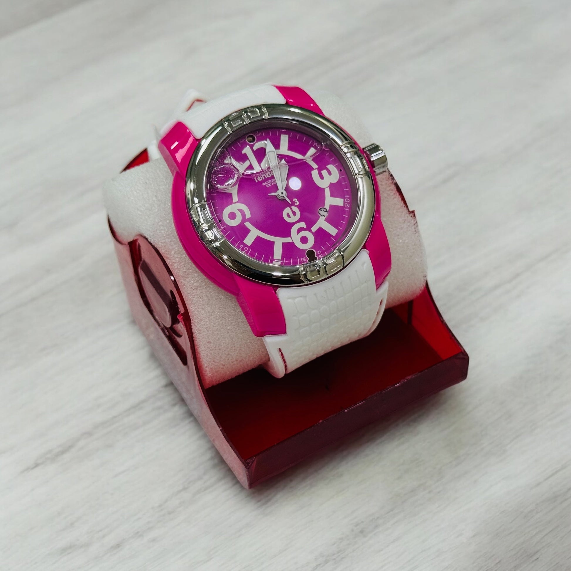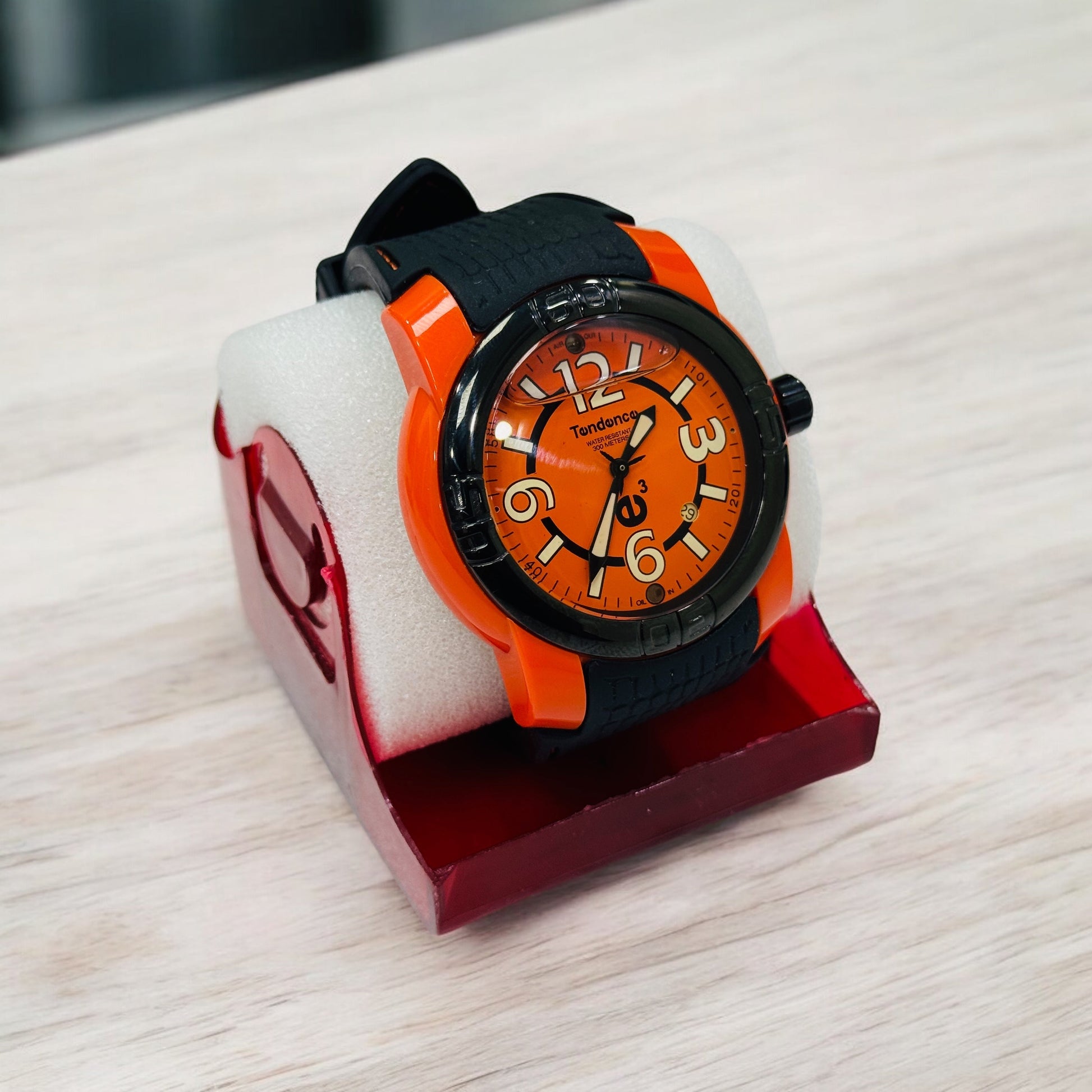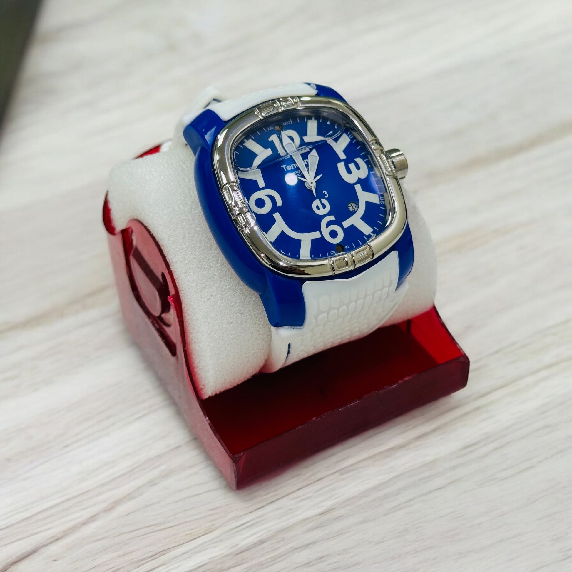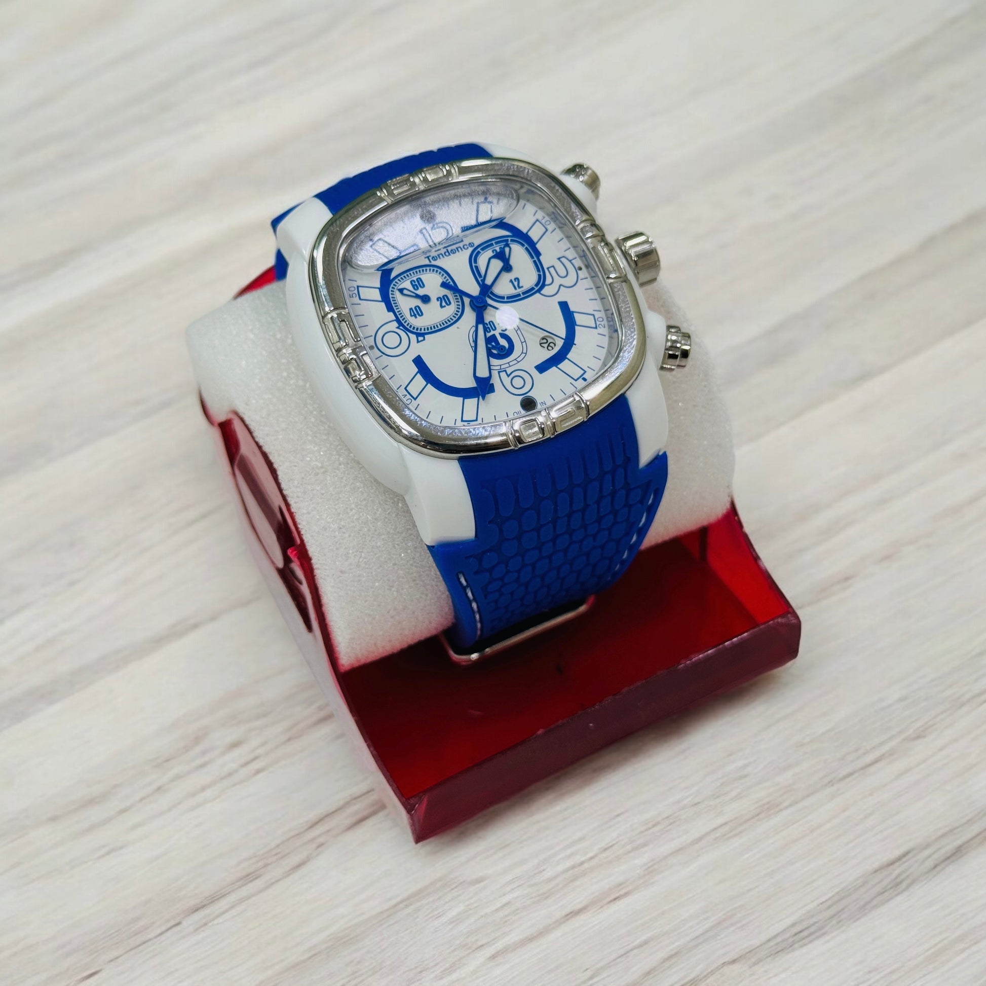 Tendence men's analog watch with blue rubber strap. It has a battery mechanism, which relies on the electricity provided by the battery, resulting in precision and durability.
